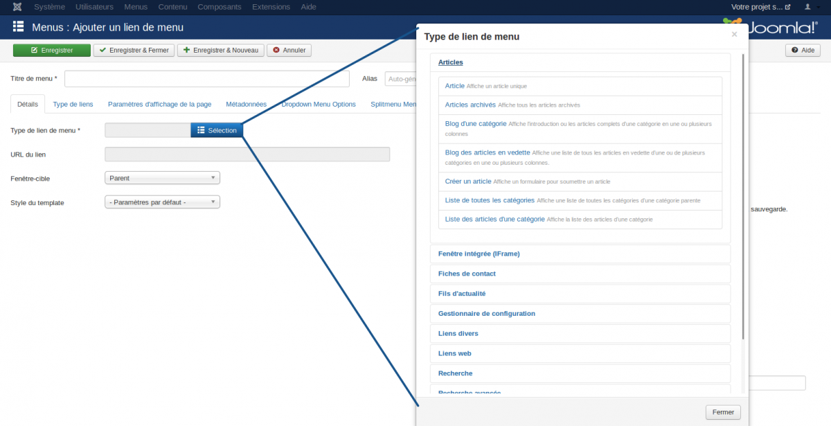 Le bouton bleu Sélection fait apparaître les choix possibles. Le contenu de cette liste dépend bien entendu des composants tiers ajoutés à Joomla, mais de base il y a la liste ci-après.